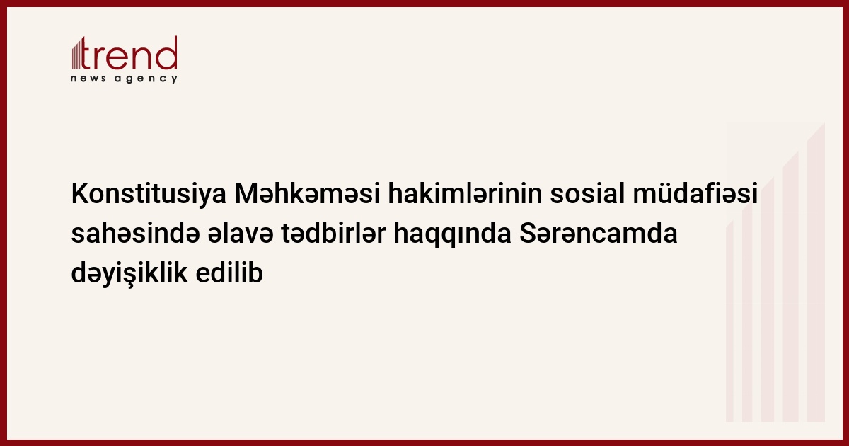 Prezident İlham Əliyev “Azərbaycan Respublikasının Konstitusiya Məhkəməsi hakimlərinin sosial müdafiəsi sahəsində əlavə tədbirlər haqqında” Azərbaycan Respublikası Prezidentinin 2000-ci il 17 may tarixli 414 nömrəli Sərəncamında dəyişiklik edilməsi barədə Sərəncam imzalayıb.