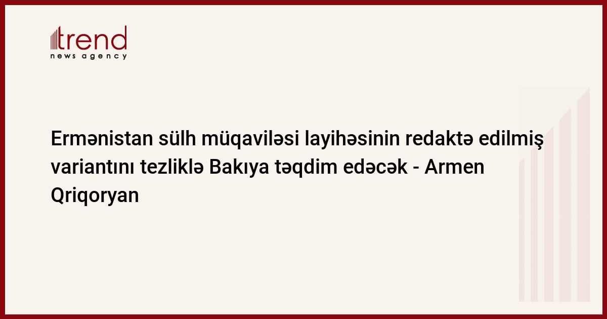 Ermənistan sülh müqaviləsi layihəsinin mətni üzərində işləməyi davam etdirir və layihənin redaktə edilmiş variantı tezliklə Bakıya təqdim ediləcək.