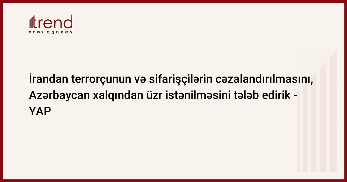 Yeni Azərbaycan Partiyası olaraq bu xain terror aktını qətiyyətlə pisləyir, şəhid olmuş Orxan Əsgərovun ailəsi və yaxınlarına dərin hüznlə başsağlığı verir, yaralı qardaşlarımıza şəfa diləyir və İran İslam Respublikasından hadisənin hərtərəfli araşdırılaraq hüquqi qiymət verilməsini, qanlı təxribat törədən terrorçunun və onun arxasında dayanan sifarişçilərin layiqincə cəzalandırılmasını, nəhayət, Azərbaycan xalqından üzr istəyərək ölkəmizə qarşı uzun müddətdir ki, davam edən isterika və təbliğata son qoyulmasını, hadisənin əsl mahiyyəti ilə bağlı dəqiq və düzgün məlumat verilməsini tələb edirik!”