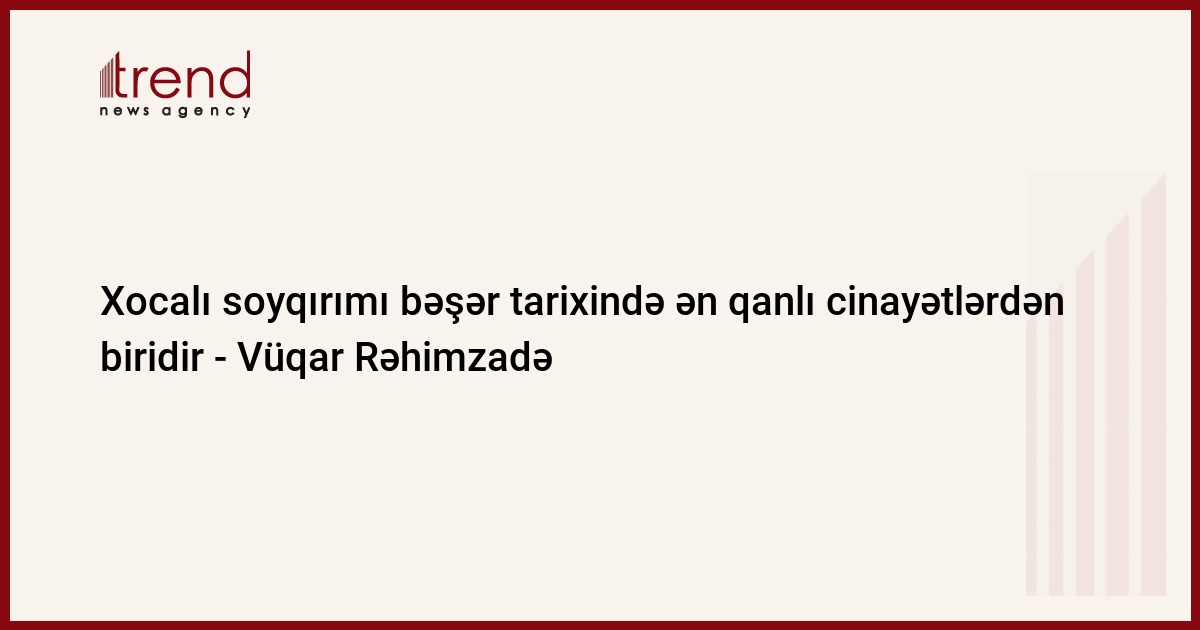 Vüqar Rəhimzadə vurğulayıb ki, zaman-zaman erməni millətçiləri tarixi Azərbaycan torpaqları hesabına mifik “böyük Ermənistan” ideyasını gerçəkləşdirmək məqsədilə ardıcıl şəkildə xalqımıza qarşı terror, kütləvi qırğın, deportasiya və etnik təmizləmə siyasəti aparıblar. Xocalı soyqırımı erməni millətçiləri və onların havadarlarının Azərbaycan xalqına qarşı həyata keçirdikləri soyqırımı siyasətinin ən qanlı səhifəsidir. Dünyanın gözü qarşısında baş vermiş, misli görünməmiş qəddarlığı və amansızlığı ilə fərqlənən bu ağır cinayətə görə siyasi-hüquqi məsuliyyət birbaşa Ermənistanın üzərinə düşür. “Bu soyqırımı, eyni zamanda, bütün bəşəriyyətə qarşı tarixi bir cinayətdir” söyləyən ulu öndər Heydər Əliyevin təşəbbüsü ilə 1994-cü il fevralın 24-də Milli Məclis Xocalı soyqırımı günü haqqında qərar qəbul etdi. Ulu öndər Heydər Əliyevin 25 fevral 1997-ci il tarixli Sərəncamı ilə Xocalı soyqırımı qurbanlarının xatirəsini yad etmək məqsədi ilə hər il fevral ayının 26-sı saat 17.00-da Azərbaycan ərazisində Xocalı soyqırımı qurbanlarının xatirəsinə ehtiram əlaməti olaraq sükut dəqiqəsi elan edilmişdir.