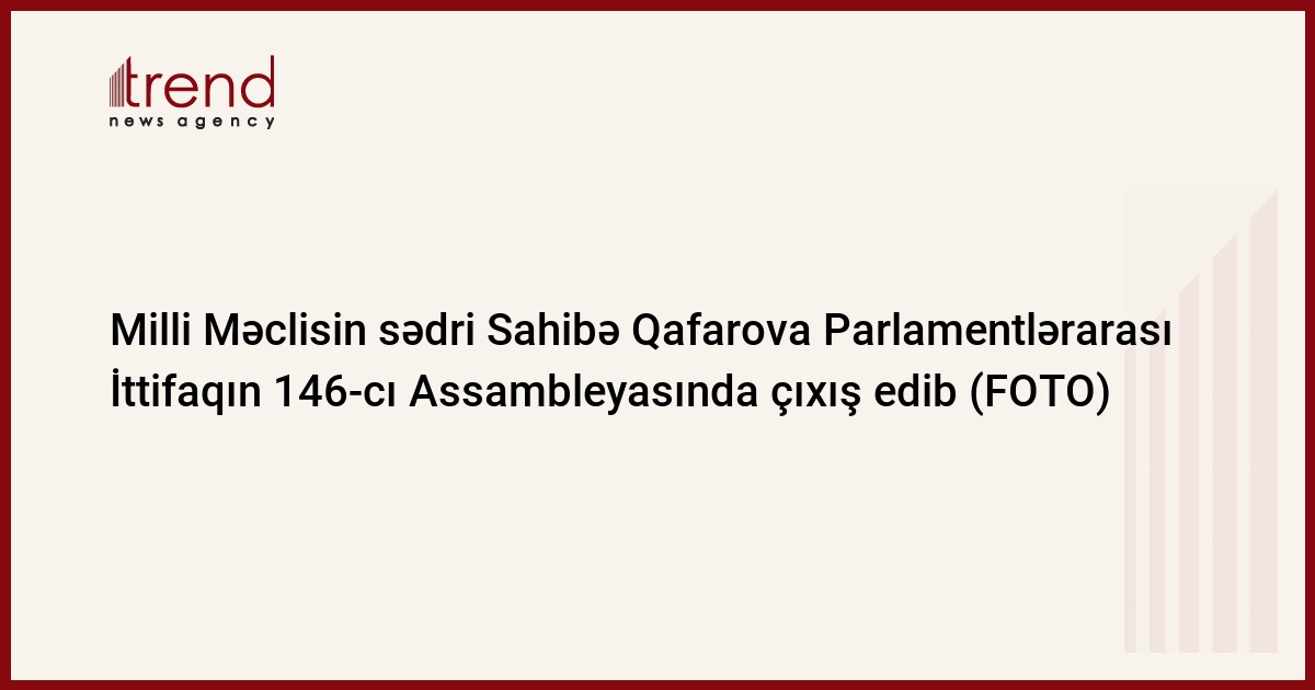 Milli Məclisin Mətbuat və ictimaiyyətlə əlaqələr şöbəsindən Trend-ə verilən məlumata görə, Milli Məclisin sədri və Parlamentlərarası İttifaqda Azərbaycan nümayəndə heyətinin rəhbəri Sahibə Qafarova Bəhreyn Krallığının paytaxtı Manama şəhərində keçirilən Parlamentlərarası İttifaqın 146-cı Assambleyasında “Dinc birgəyaşayışın və inklüziv cəmiyyətlərin təşviqi: dözümsüzlüklə mübarizə” mövzusunda çıxış edib.