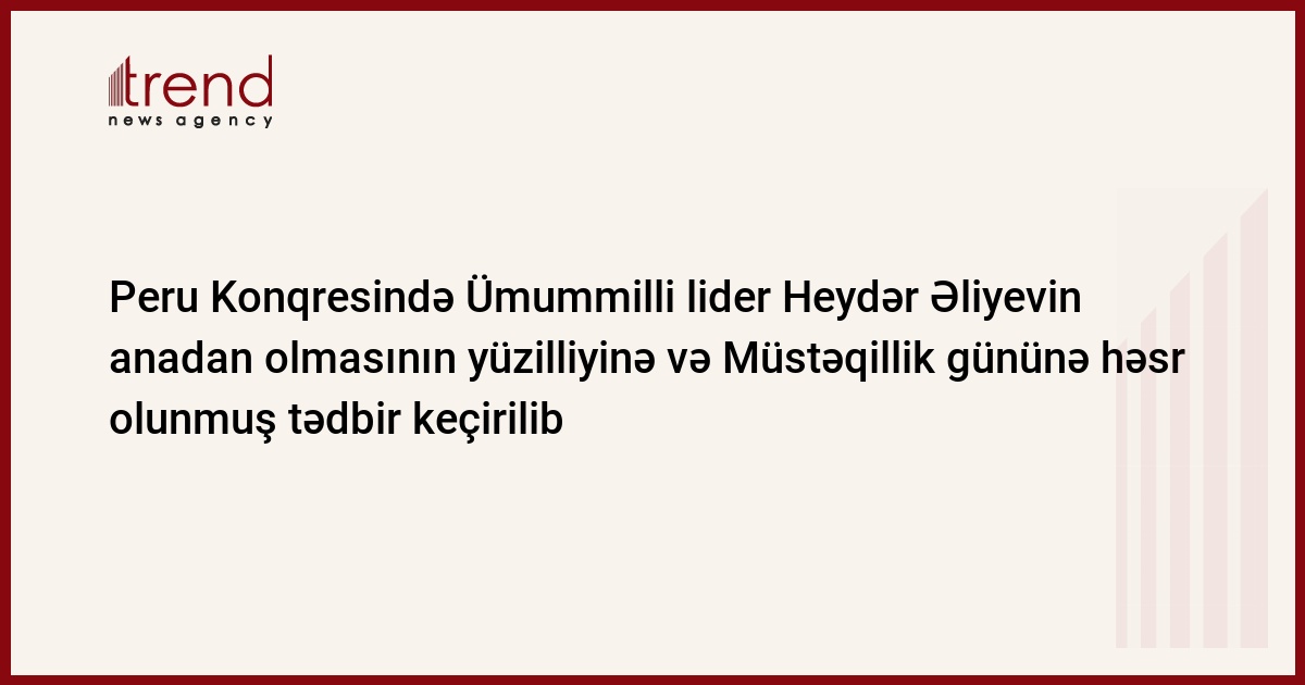 Peru-Azərbaycan parlamentlərarası dostluq qrupunun dəstəyi ilə Peru Konqresində Ümummilli lider Heydər Əliyevin anadan olmasının yüzilliyinə və Azərbaycan Xalq Cümhuriyyətinin qurulmasının 105-ci ildönümünə həsr olunmuş tədbir keçirilib.