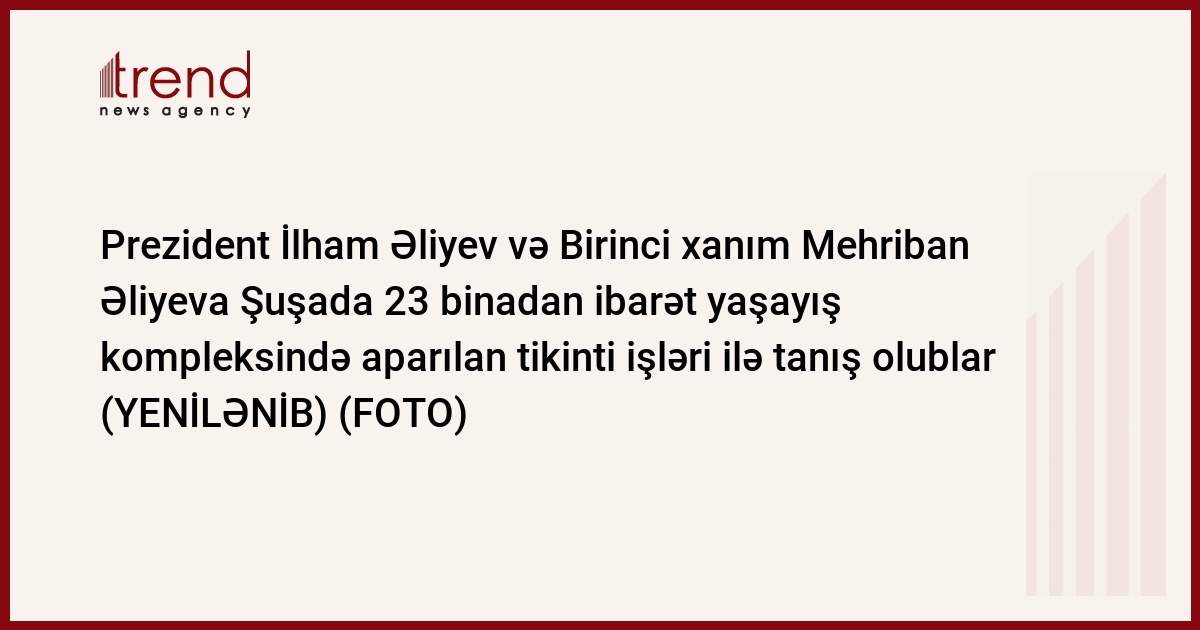 Trend xəbər verir ki, dövlətimizin başçısı və birinci xanım Şuşa şəhərində 23 binadan ibarət yaşayış kompleksində aparılan tikinti işləri ilə tanış olublar.