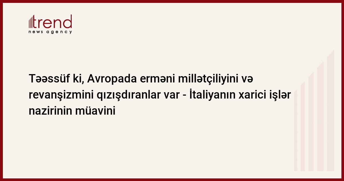Trend xəbər verir ki, Avropa parlamentinin İtaliyanın müxalifət “5 Ulduz hərəkatı” partiyasından üzvü Fabio Massimo Kastaldonun Avropa Ittifaqı və Avropa Parlamentinin rəsmilərinə ünvanlanmış ədalətsiz və əsassız çağırışlarına münasibətdə nazir müavini E.Çirielli bunun uyğunsuz bir hərəkət olduğunu və indiyədək əldə olunan sülh razılaşmalarına xələl gətirmək riski daşıdığını, həm tarix, həm də beynəlxalq münasibətlər nöqteyi-nəzərindən az məlum olan hadisələrlə əlaqədar fəaliyyətə keçmək və ya birbaşa müdaxilə etmək üçün ən pis üsul olduğunu, habelə Avropa və İtaliyanın xüsusi tərzdə Azərbaycan və Ermənistan arasında yumşalma mühiti yaratmaq üçün çalışmalı olduğunu bildirib.