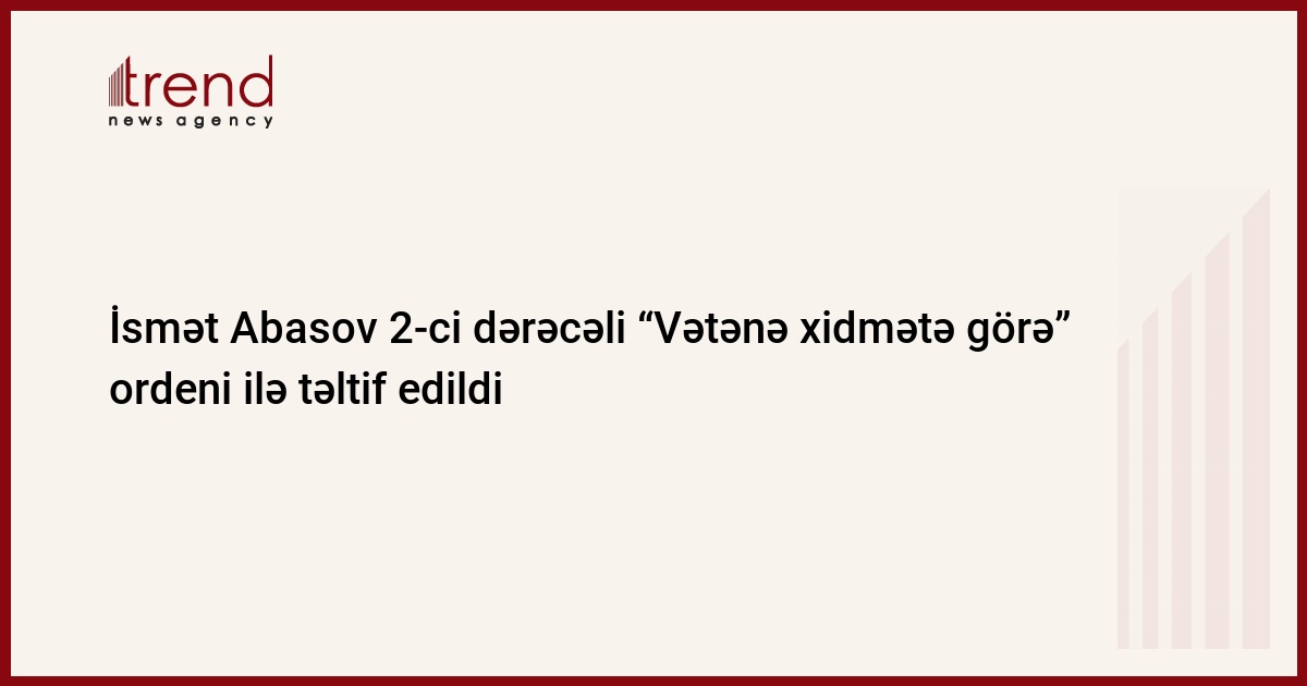 Trend xəbər verir ki, sərəncama əsasən, Azərbaycan Respublikasının ictimai həyatında səmərəli fəaliyyətinə görə İsmət Dursun oğlu Abasov 2-ci dərəcəli “Vətənə xidmətə görə” ordeni ilə təltif edilsin.