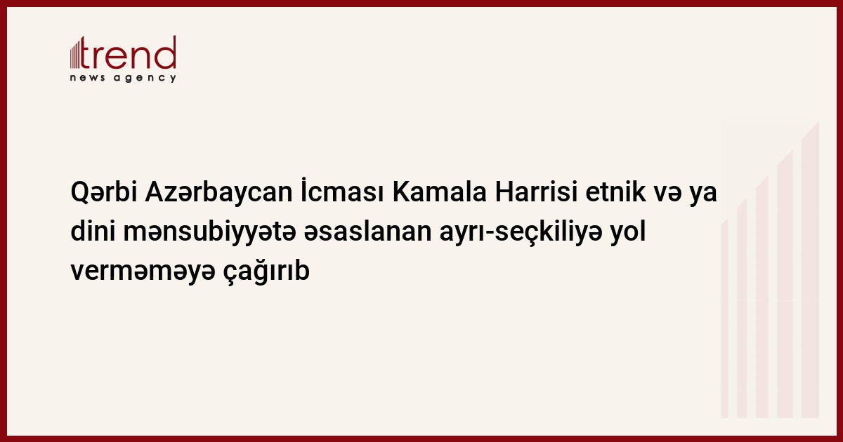 Qərbi Azərbaycan İcması ABŞ-nin vitse-prezidenti Kamala Harrisi qayıdış hüququ məsələsində etnik və ya dini mənsubiyyətə əsaslanan ayrı-seçkiliyə yol verməməyə çağırıb.