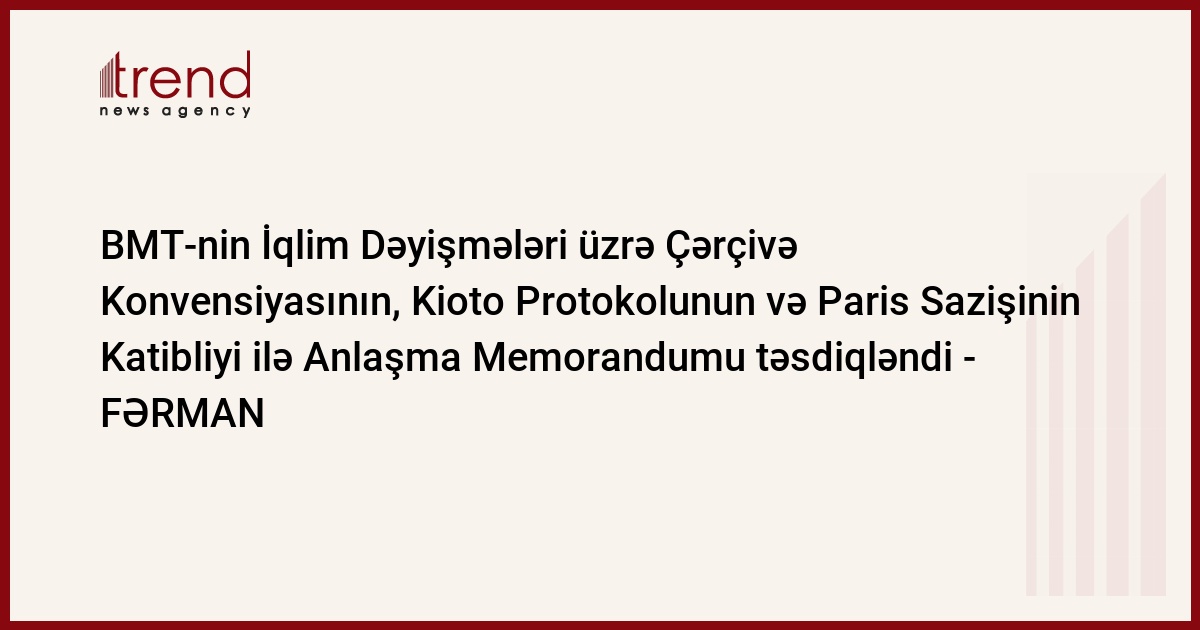 2024-cü il sentyabrın 4-də Bakı şəhərində və 2024-cü il sentyabrın 9-da Bonn şəhərində imzalanmış “Azərbaycan Respublikası Hökuməti ilə Birləşmiş Millətlər Təşkilatının İqlim Dəyişmələri üzrə Çərçivə Konvensiyasının, Kioto Protokolunun və Paris Sazişinin Katibliyi arasında məlumat mübadiləsi haqqında Anlaşma Memorandumu” təsdiq edilib.
