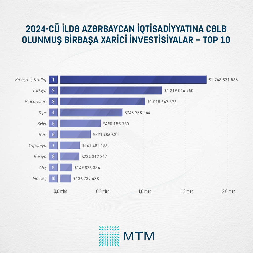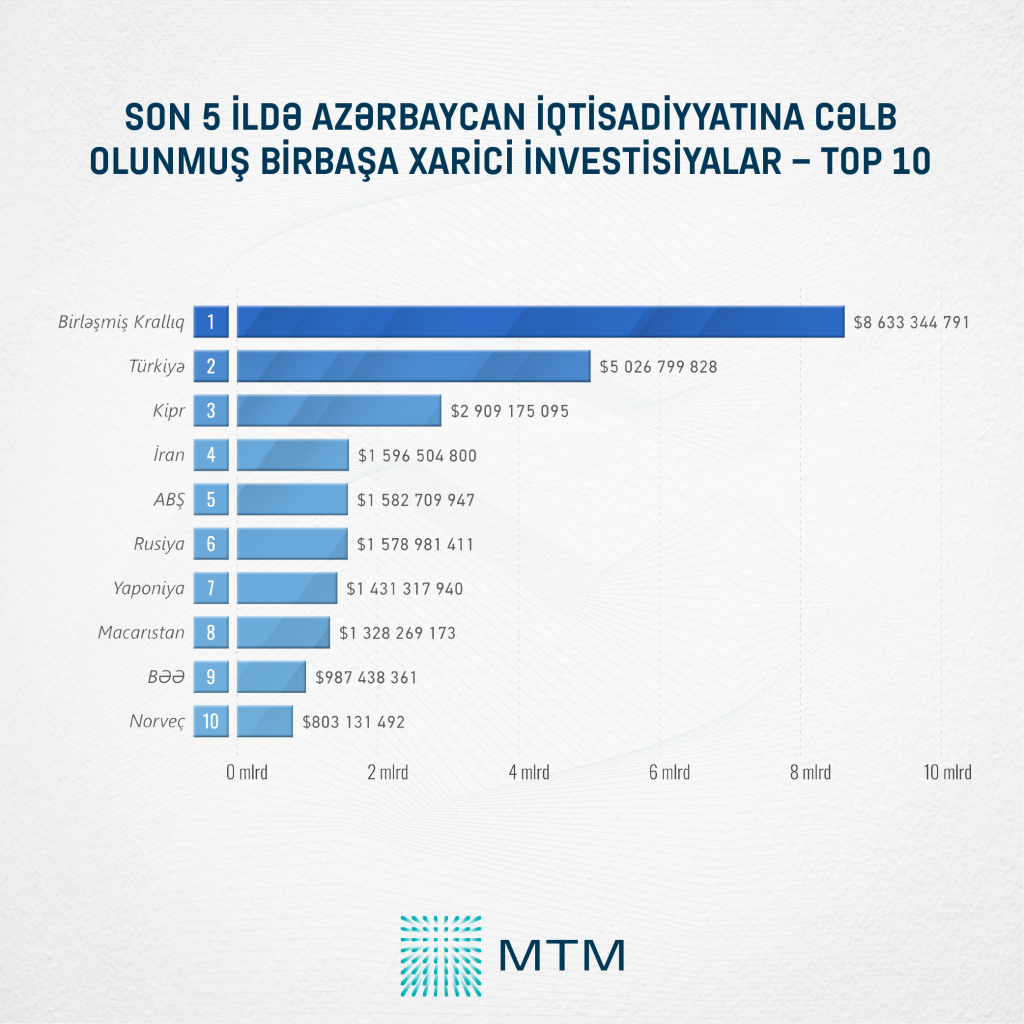 Son 5 ilin hər birində ölkəmizə ən çox birbaşa investisiya yönəldən ölkə Birləşmiş Krallıq olub. Qeyd edək ki, 2020-2024-cü illərdə Birləşmiş Krallıqdan ölkə iqtisadiyyatına 8 633 344 791 dollar (8,63 milyard $) birbaşa xarici investisiya cəlb olunub. İkinci sıranı 5 026 799 828 dollar (5,03 milyard $) ilə Türkiyə tutub. Üçüncü sırada isə digər türk dövləti olan Kipr yer alıb. Son 5 ildə Kiprdən ölkəmizə 2 909 175 095 dollar (2,91 milyard $) həcmində birbaşa xarici investisiya cəlb olunub. Ümumilikdə son 5 ildə Azərbaycan iqtisadiyyatına 29,3 milyard dollar (29 303 112 477 $) birbaşa xarici investisiya cəlb olunub ki, bu məbləğin 88,3%-i cədvəldə də göründüyü kimi 10 ölkənin payına düşür.