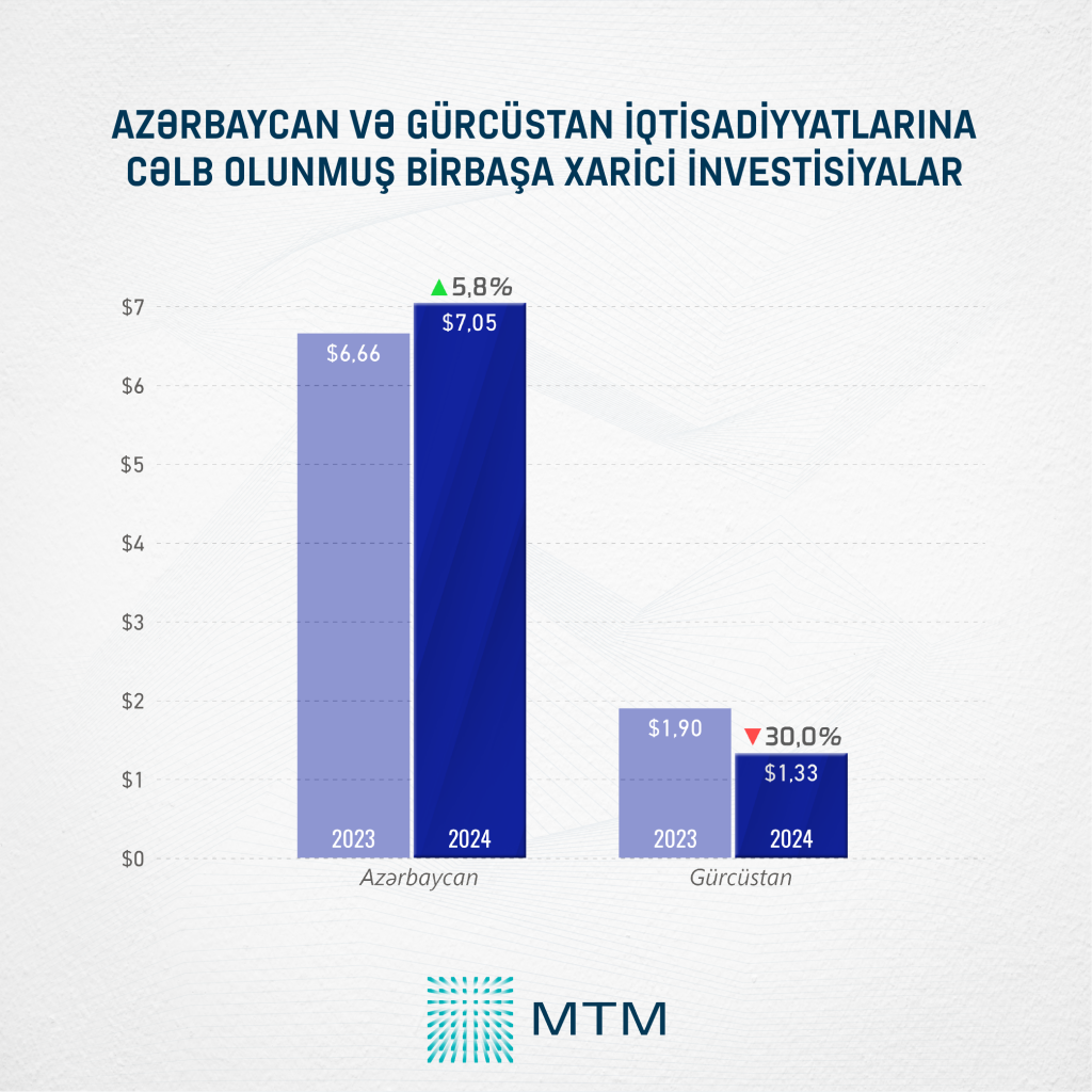 Rəqəmlərlə ifadə etsək, 2024-cü ildə Azərbaycan iqtisadiyyatına cəlb olunan birbaşa xarici investisiyaların həcmi 2023-cü ilə nisbətən 5,8% artaraq 7,05 milyard dollar (7 046 217 257 $) , Gürcüstanda isə 30% azalaraq 1,33 milyard dollar (1 333 818 169 $) təşkil edib.