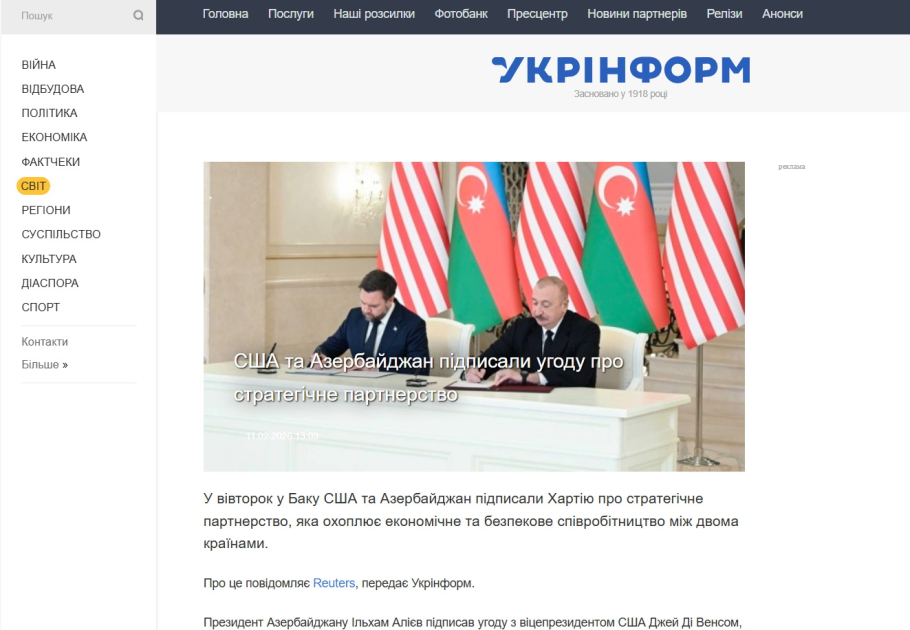 ABŞ-ın Vitse-prezidenti Cey. Di. Vensin Azərbaycana səfəri Ukrayna mediasında geniş işıqlandırılıb.