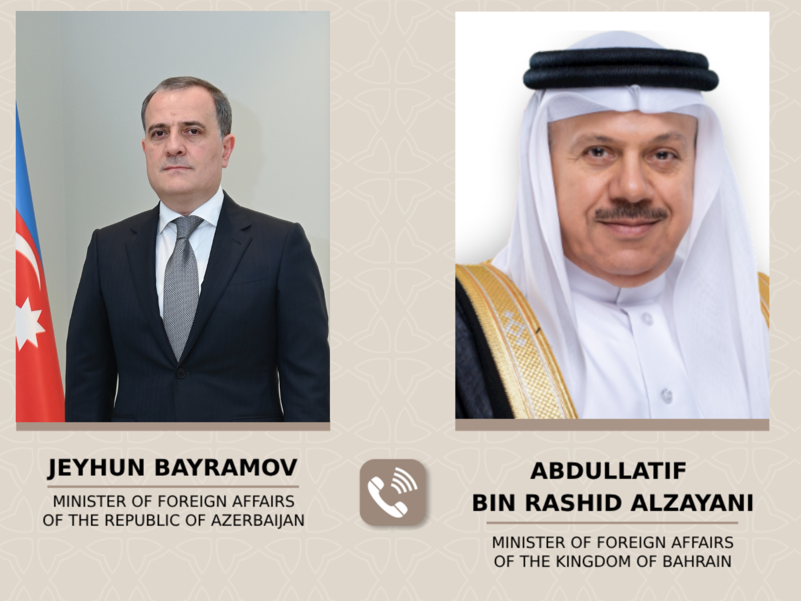 2 mart 2026-cı il tarixində Azərbaycan Respublikasının xarici işlər naziri Ceyhun Bayramov ilə Bəhreyn Krallığının xarici işlər naziri Abdullətif bin Rəşid əl-Zayani arasında telefon danışığı baş tutub.
