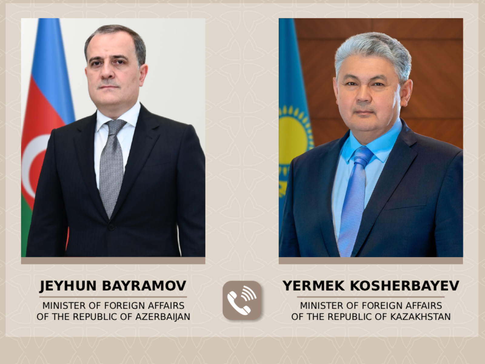 5 mart 2026-cı il tarixində Qazaxıstan Respublikasının xarici işlər naziri Yermek Koşerbayev Azərbaycan Respublikasının xarici işlər naziri Ceyhun Bayramova zəng vurub.