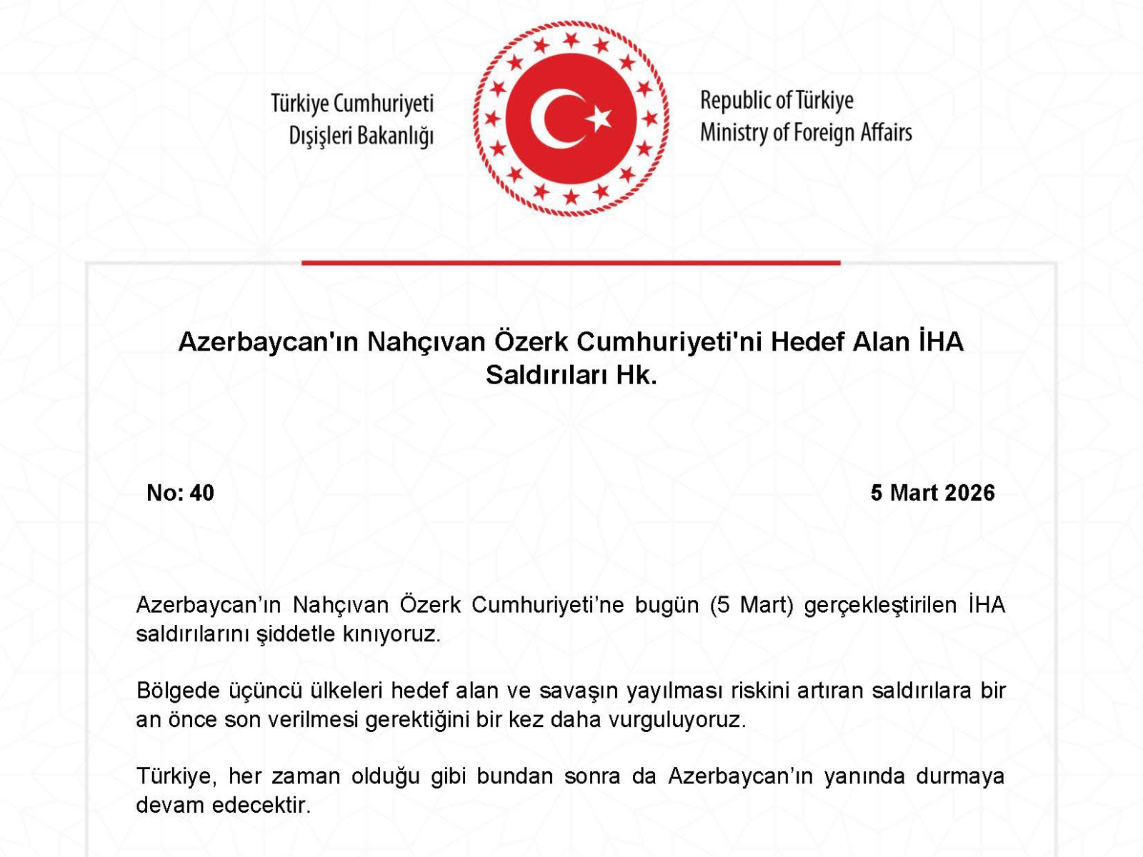 Bu gün Azərbaycanın Naxçıvan Muxtar Respublikasına qarşı həyata keçirilən PUA hücumlarını qətiyyətlə pisləyirik.
