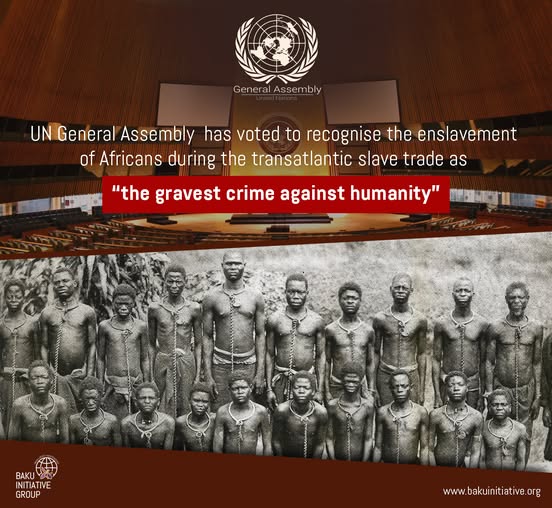 Bakı Təşəbbüs Qrupu (BTQ) BMT Baş Assambleyası tərəfindən qəbul edilmiş transatlantik qul ticarətini "bəşəriyyətə qarşı törədilmiş ən ağır cinayət" kimi tanıyan qətnaməni tam dəstəkləyir.