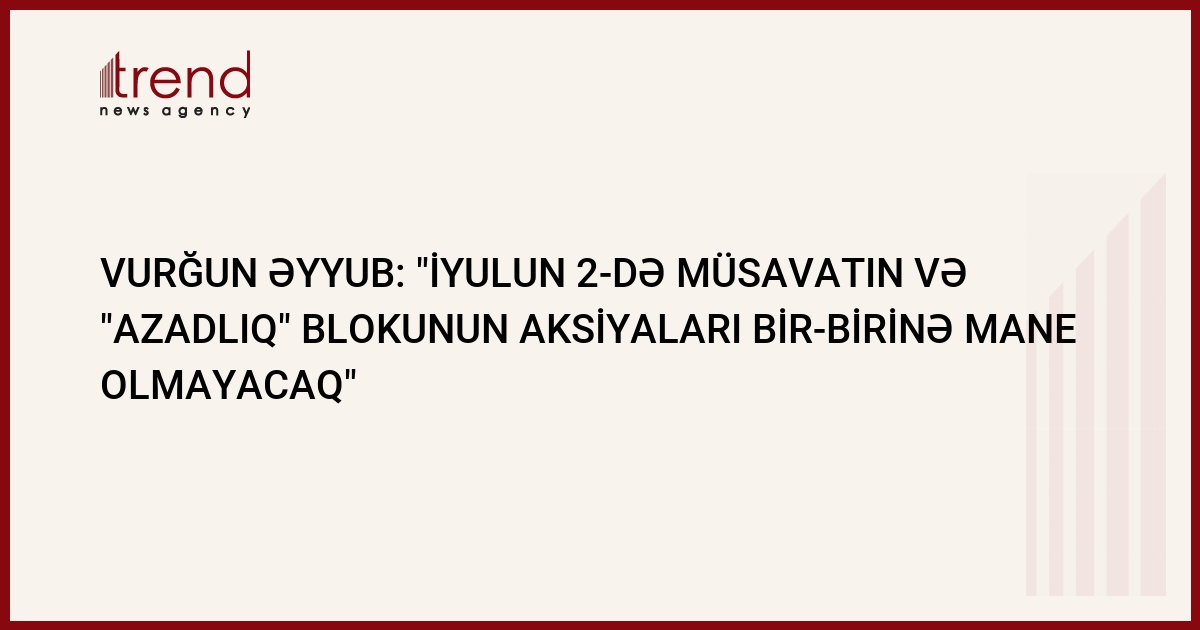 "İyulun 2-də Müsavat Partiyasının Bakı Şəhər İcra Hakimiyyəti qarşısında keçirəcəyi piketlə "Azadlıq" blokunun həmin günkü digər aksiyaları bir-birinə mane olmayacaq". Bu fikirləri Trend ə açıqlamasında Müsavat Partiyası başqanının birinci müavini Vurğun Əyyub bildirib.