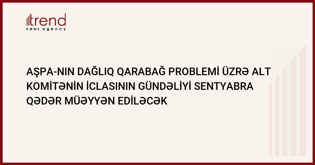 Avropa Şurası Parlament Assambleyası (AŞPA) tərəfindən yaradılmış Dağlıq Qarabağ problemi üzrə alt komitənin sentyabrın 12-də keçirilməsi nəzərədə tutulan ilk iclasının gündəliyi sentyabra qədər müəyyən ediləcək. Bu barədə Trend ə Azərbaycan Milli Məclisinin AŞPA-dakı nümayəndə heyətinin üzvü Asim Mollazadə məlumat verib.