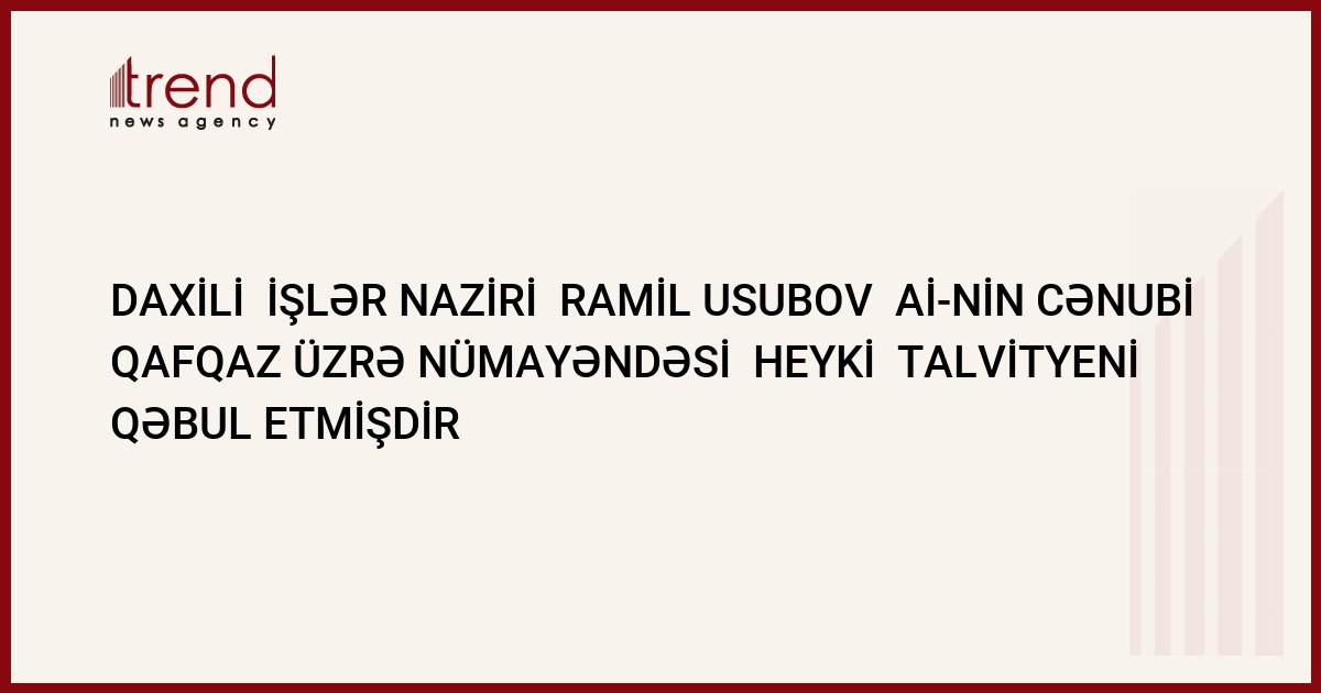 İyulun 6-da daxili işlər naziri , general -polkovnik Ramil Usubov Bakıda səfərdə olan Avropa İttifaqının(Aİ) Cənubi Qafqaz üzrə nümayəndəsi Heyki Talvityeni qəbul etmişdir. Bu haqda Trend ə DİN-in mətbuat xidmətindən bildirilmişdir.