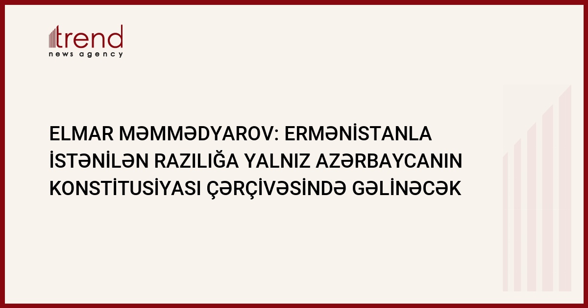 "Ermənistanla istənilən razılığa yalnız Azərbaycanın Konstitusiyası çərçivəsində gəlinəcək". Trend agentliyinin məlumatına görə, bu barədə jurnalistlərə AR xarici işlər naziri Elmar Məmmədyarov Minsk qrupu həmsədrlərinin Azərbaycana səfərləri gedişində onlarla son danışıqları şərh edərkən bildirib.