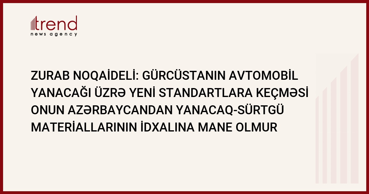 Gürcüstanın avtomobil yanacağı üzrə yeni standartlara keçidi (Avropa İttifaqı) Azərbaycandan yanacaq-sürtgü materiallarının idxalına təsir etməyəcəyək. Bu barədə iyulun 19-da Gürcüstanın baş naziri Zurab Noqaideli Trend ə məlumat verib.