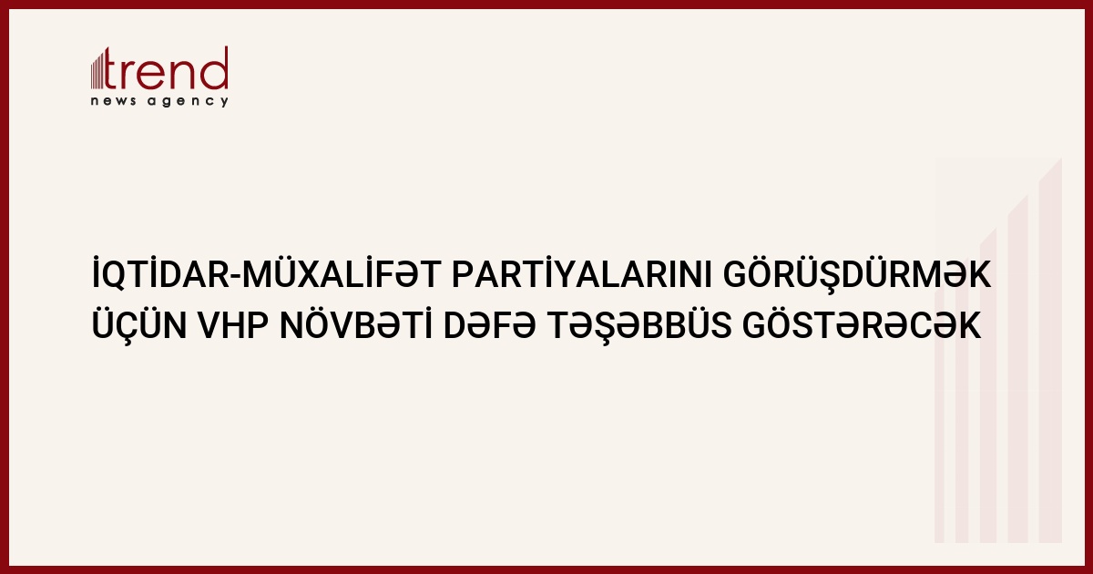 Avqustun 10-da Vətəndaş Həmrəyliyi Partiyasının (VHP) qərargahında keçirilməsi nəzərdə tutulmuş iqtidar-müxalifət partiyalarının görüşü baş tutmayıb. VHP sədri Trend ə bildirib ki, görüşün təxirə salınması barədə iştirakçı partiyalara öz adından məktub göndərib.