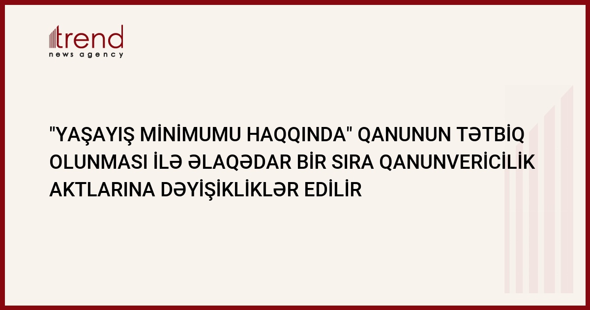 Azərbaycan Respublikasının prezidenti İlham Əliyev "Yaşayış minimumu haqqında" qanunun tətbiq edilməsi ilə əlaqədar ölkənin bir sıra qanunvericilik aktlarına dəyişikliklərin edilməsinə dair sərəncam imzalayıb.