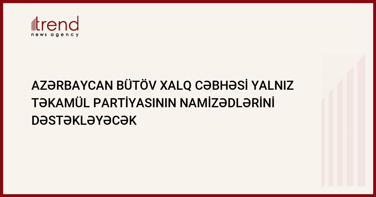 "Bütöv Azərbaycan Xalq Cəbhəsi Partiyası (BAXCP) yalnız Milli Demokratik Qüvvələr Birliyinə (MDQB) daxil olan Təkamül Partiyasının namizədlərini dəstəkləyəcəyik. Çünki yalnız onlarla bu birlikdə təmsil olunuruq" Bu barədə Trend agentliyinə BAXCP sədrinin müavini Elçin Mirzəbəyli verib.