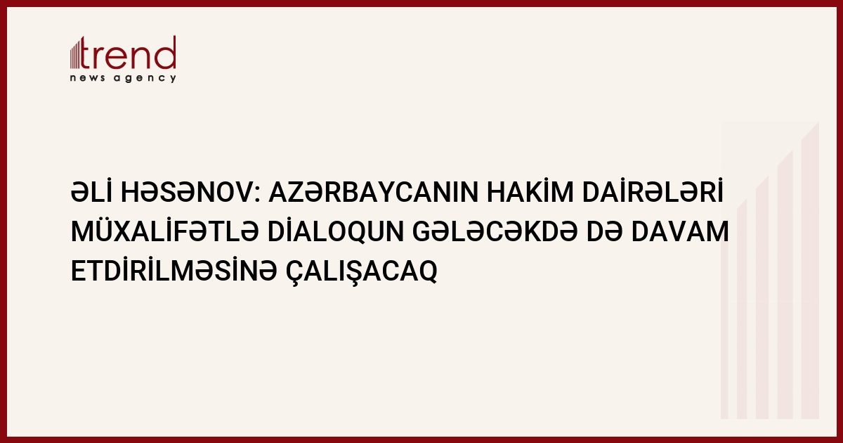 "Azərbaycanın hakim dairələri ölkənin siyasi qüvvələri arasında dialoqun gələcəkdə də davam etdirilməsinə çalışacaq". Trend in məlumatına görə, bu barədə prezidentin İcra Aparatının ictimai-siyasi şöbəsinin rəisi Əli Həsənov bildirib.