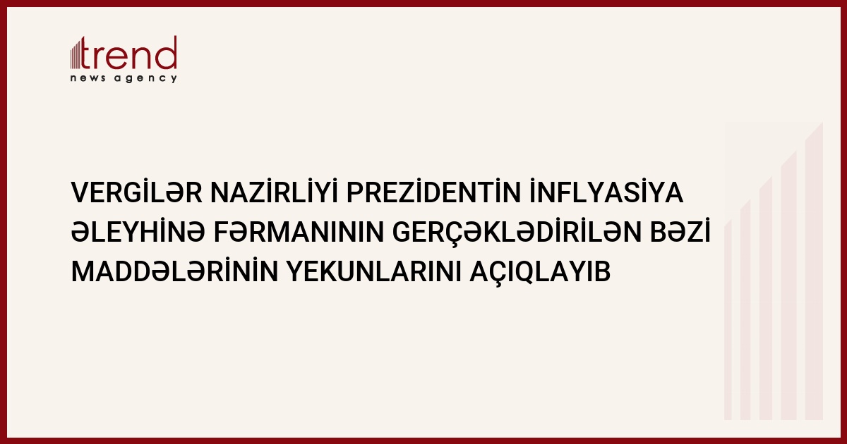 Azərbaycanın vergilər nazirliyi prezidentin "Azərbaycanda inflyasiya əleyhinə tədbirlərin gücləndirilməsi haqqında" fərmanının icrası üzrə fəal tədbirlər gerçəkləşdirir.