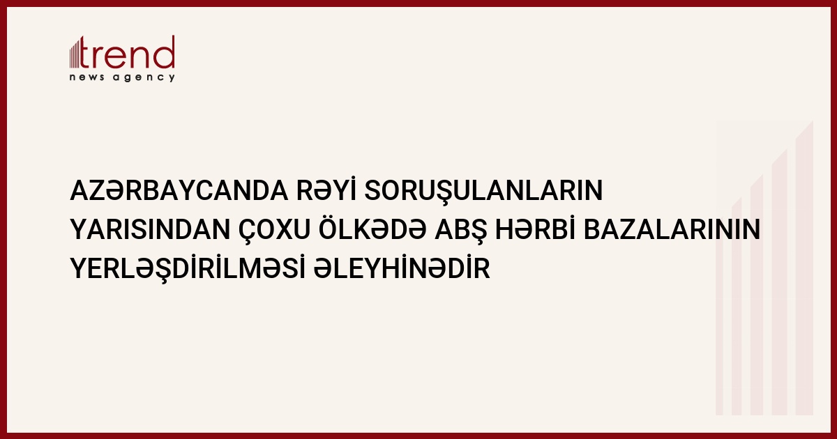 "Rəy" sosioloji mərkəzinin avqust ayında Azərbaycanın 33 yaşayış məntəqəsində keçirdiyi ictimai rəy sorğusunun nəticələrinə görə, rəyi soruşulanların yarısından çoxu respublikada Amerika bazalarının yerləşdirilməsi əleyhinədir. Bu barədə Trend ə "Rəy" mərkəzinin direktoru Rizvan Abbasov məlumat verib.