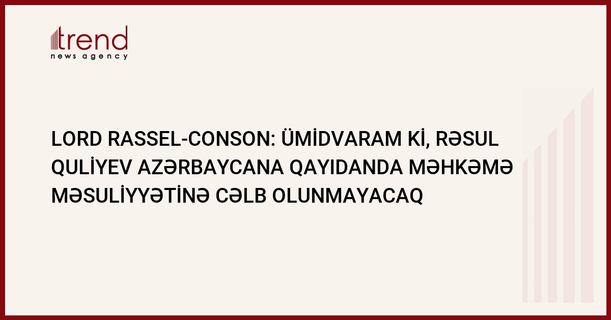 "Ümidvaram ki, eks-spiker, Azərbaycan Demokrat partiyasının lideri Rəsul Quliyev Azərbaycana gələn kimi məhkəmə məsuliyyətinə cəlb olunmayacaq və qarşıdakı parlament seçkilərində iştirak edə biləcək. Bu barədə AŞ PA-nın keçmiş prezidenti, AŞ PA-nın üzvü Lord Rassel-Conson sentyabrın 5-də Bakıda keçirilən "Seçkilər və demokratik inkişaf"a həsr olunmuş konfransda bildirib.