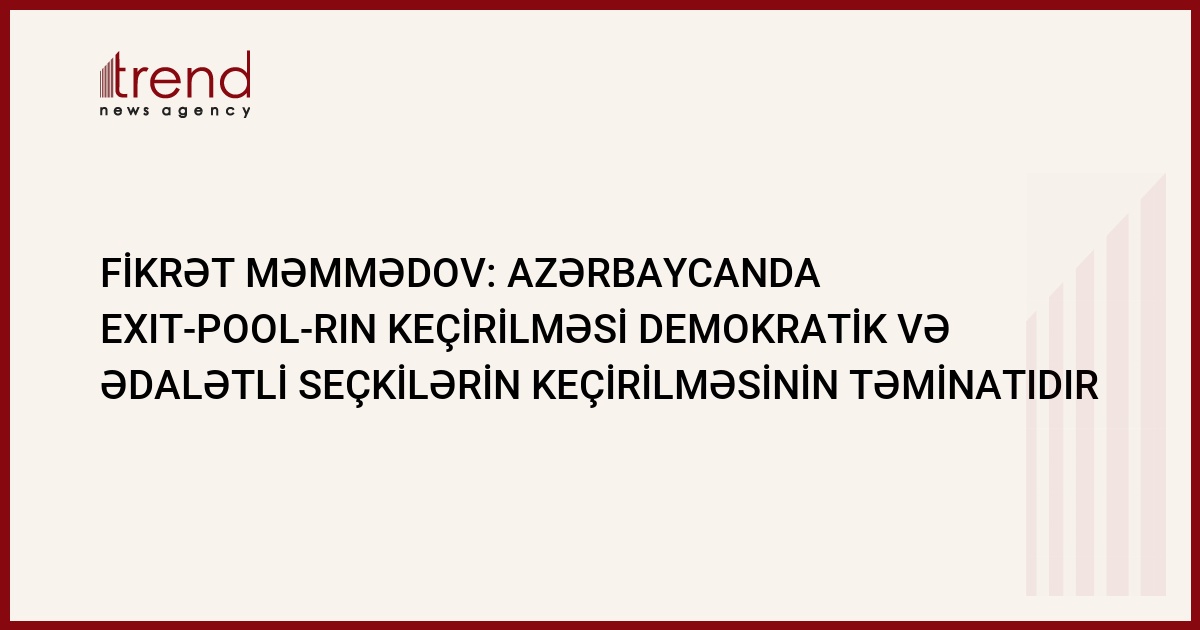 Azərbaycanda exit-pool-ın keçirilməsi ölkədə demokratik və ədalətli seçkilərin keçirilməsinin təminatıdır. Trend in məlumatına görə, bu barədə Azərbaycanın ədliyyə naziri Fikrət Məmmədov sentyabrın 5-də Bakıda keçirilən mətbuat konfransında bəyan edib.