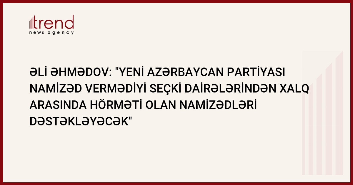 "Yeni Azərbaycan Partiyası (YAP) namizəd vermədiyi seçki dairəsindən namizədliyi qeydə alınan və xalq tərəfindən hörmət bəslənilən nüfuzlu şəxsləri dəstəkləyəcək". Bu barədə Trend agentliyinə YAP-ın icra katibi Əli Əhmədov bildirib.