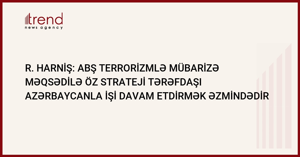 ABŞ terrorizm tamamilə məhv edilənədək öz strateji tərəfdaşı Azərbaycanla işi davam etdirmək əzmindədir. Trend bildirir ki, bu fikir ABŞ-nın Azərbaycandakı səfiri Rino Harnişin 11 sentyabr terror aktlarının 4-cü ildönümünə həsr olunmuş məqaləsində qeyd olunur.