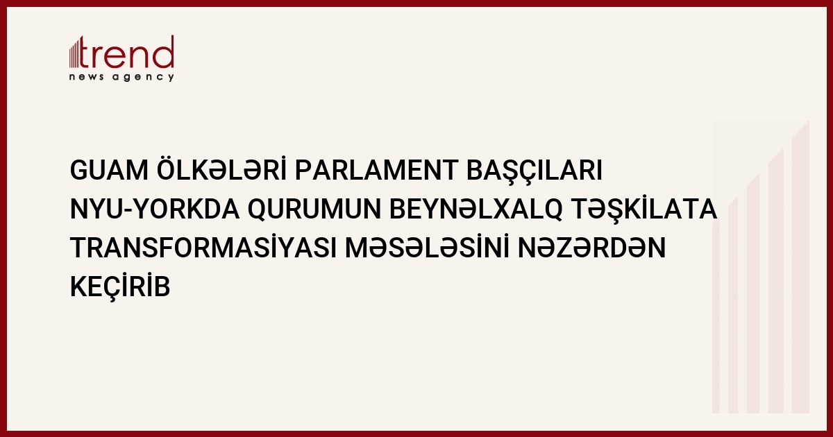 GUAM-ın beynəlxalq təşkilata transformasiyası məsələləri Nyu-Yorkda Gürcüstan, Ukrayna, Azərbaycan və Moldova parlament başçılarının görüşündə nəzərdən keçirilib.Diplomatik mənbələrdən Trend ə məlum olub ki, forumda GUAM-ın bütün dörd ölkəsinin parlament rəhbərləri iştirak edib.