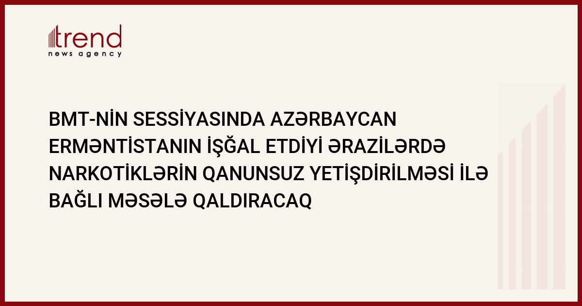 BMT-nin Yaxın və Orta Şərqdə narkotiklərin qanunsuz dövriyyəsi və bununla bağlı məsələlər üzrə yardımçı komissiyasının sentyabrın 12-dən 16-na kimi Bakıda keçiriləcək 40-cı sessiyasında Azərbaycan Ermənistanın işğal etdiyi ərazilərdə narkotik vasitələrin qanunsuz yetişdirməsinə dair məsələ qaldıracaq. Trend in xəbər verdiyi kimi, bu barədə jurnalistlərə sentyabrın 12-də baş nazirin müavini, narkotiklərlə mübarizə üzrə dövlət komissiyasının sədri Əli Həsənov məlumat verib.