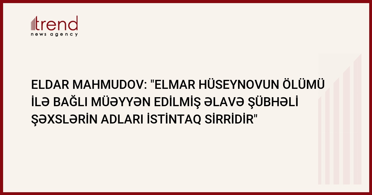 Azərbaycan Respublikası Milli Təhlükəsizlik naziri Eldar Mahmudov "Monitor" jurnalının baş redaktoru Elmar Hüseynovun öldürülməsi faktı ilə bağlı əlavə şübhəli şəxslərin müəyyən edildiyini təsdiqləyib. Trend məlumat verir ki, nazir həmin şəxslərin adlarının açıqlanmamasının səbəbini istintaqın gedişinə maneçilik törədə biləcəyi ilə əlaqələndirib.