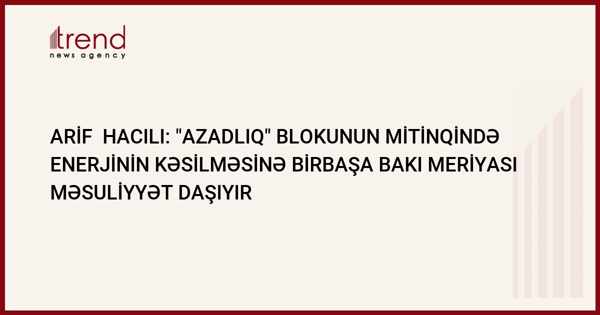 "Azadlıq" blokunun növbəti mitinqində səsgücləndiricilərə gələn elektrik enerjisinin kəsilməsində məsuliyyəti birbaşa Bakı Şəhər İcra Hakimiyyəti daşıyır". Bu barədə Trend agentliyinə müxalifətyönlü "Azadlıq" blokunun təsisçilərindən olan Müsavat Partiyası sədrinin müavini Arif Hacılı bildirib.