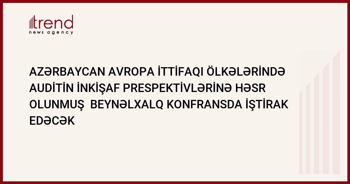 Azərbaycan Avropa İttifaqı ölkələrində auditin inkişafı məsələlərinə dair beynəlxalq konfransda iştirak edəcək. Tədbirdə Azərbaycanı Auditorlar Palatasının sədri Vahid Novruzov təmsil edəcək. Trend in məlumatına görə, bu barədə sentyabrın 13-də V.Novruzov məlumat verib.