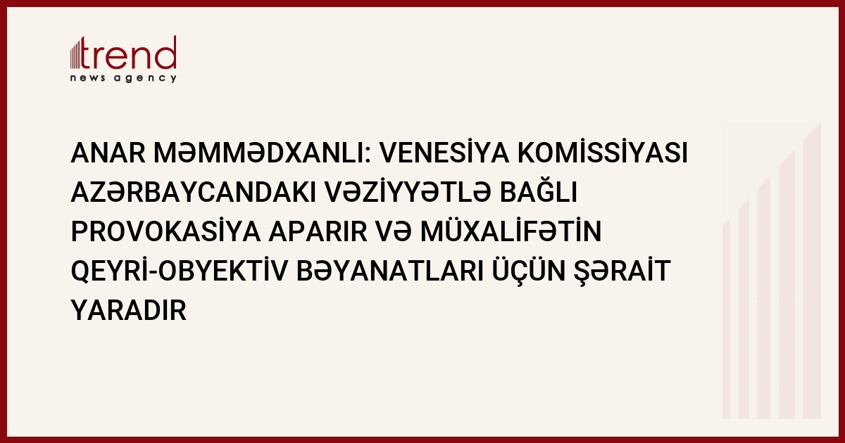 Venesiya komissiyasının (VK) Azərbaycanın Seçki məcəlləsi üzrə son birgə qiymətləndirmə layihəsi ən sadə yalnış qənaətə və son dərəcə qeyri-peşəkarlığa nümunədir.Sənədə belə bir qiymətləndirməni Trend ə eksklüziv olaraq Milli Məclisin deputatı Anar Məmmədxanov verib.