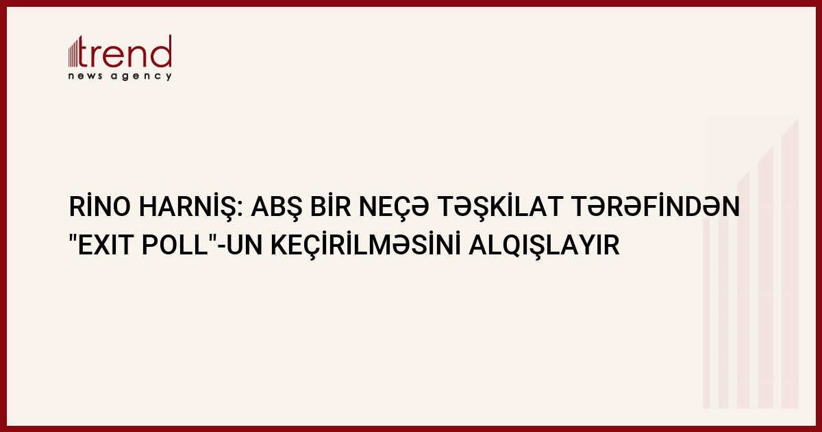 Trend bildirir ki, sentyabrın 14-də jurnalistlərlə görüşdə ABŞ-nın Bakıdakı səfiri Rino Harniş ölkədə keçiriləcək 6 noyabr parlament seçkilərində daha iki təşkilata "exit poll" keçirməyə icazə verilməsinə dair Azərbaycan hakimiyyətinin qərarını şərh edərkən bəyan edib.