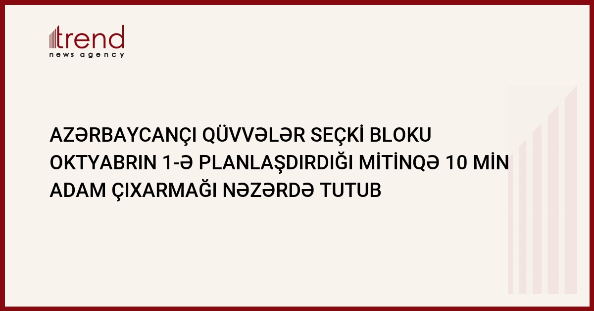 "Azərbaycançı Qüvvələr (AQ) seçki bloku oktybarın 1-ə planlaşdırdığı mitinqə 10 min insan çıxarmağı nəzərdə tutub". Bu barədə Trend agentliyinə AB seçki blokunun təisiçilərindən olan Vəhdət Partiyasının sədri Tahir Kərimli bildirib.