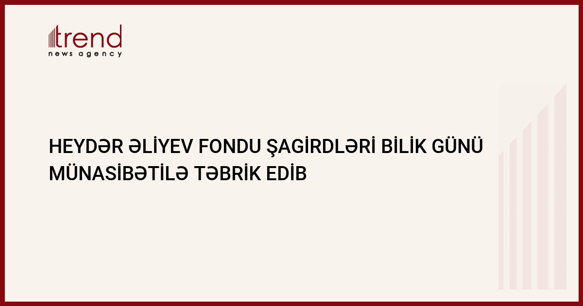 Heydər Əliyev fondu Azərbaycanın şagirdlərini 15 sentyabr - bilik günü münasibətilə təbrik edib.Fondun icraçı direktoru Anar Ələkbərov Trend ə bildirib ki, bu gün Azərbaycanın ayrı-ayrı rayon və kəndlərində uşaqlar Fondun "Yeniləşən Azərbaycana yeni məktəb" proqramı çərçivəsində tikilən yeni məktəblərə gedib və hədiyyə olaraq məktəb ləvazimatı alıb.