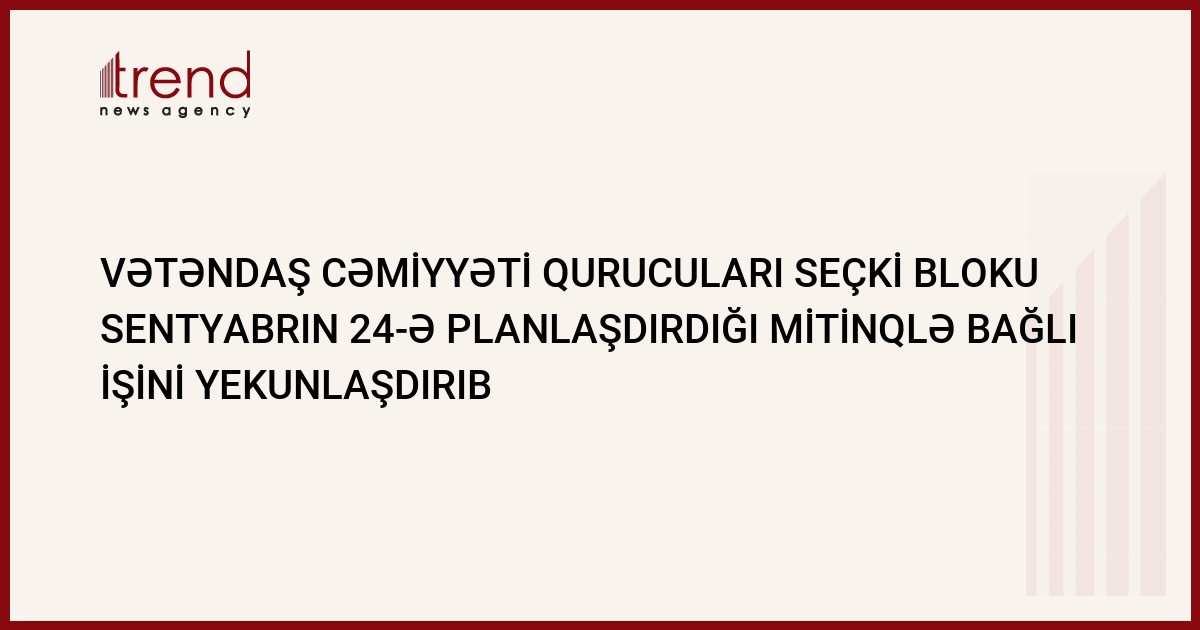 "Vətəndaş Cəmiyyəti Qurucuları (VQC) seçki bloku sentyabrın 24-də saat 17.00-da keçirəcəkləri mitinqə hazırlıqla bağlı işini yekunlaşdırıb". Bu barədə Trend agentliyinə VQC seçki bloku mərkəzi seçki qərargahının rəhbəri Yaşar Cəfərli bildirib.