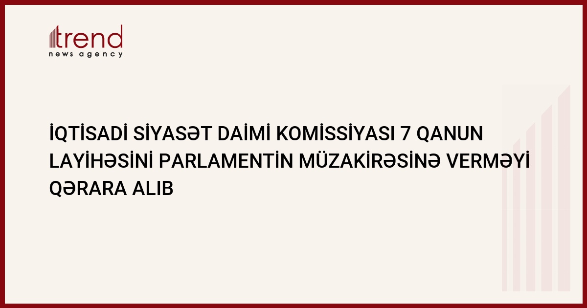 "Milli Məclisin iqtisadi siyasət daimi komissiyasının sentyabrın 23-də keçirdiyi iclasında 7 qanun layihəsi qəbul edilərək parlamentin müzakirəsinə verilib". Trend xəbər verir ki, yalnız iqtisadi siyasət daimi komissiyasının elm və təhsil məsələləri daimi komissiyası ilə birgə hazırladığı "İnşaat fəaliyyəti haqqında" qanun layihəsinin qəbulu növbəti iclaslara saxlanılıb.