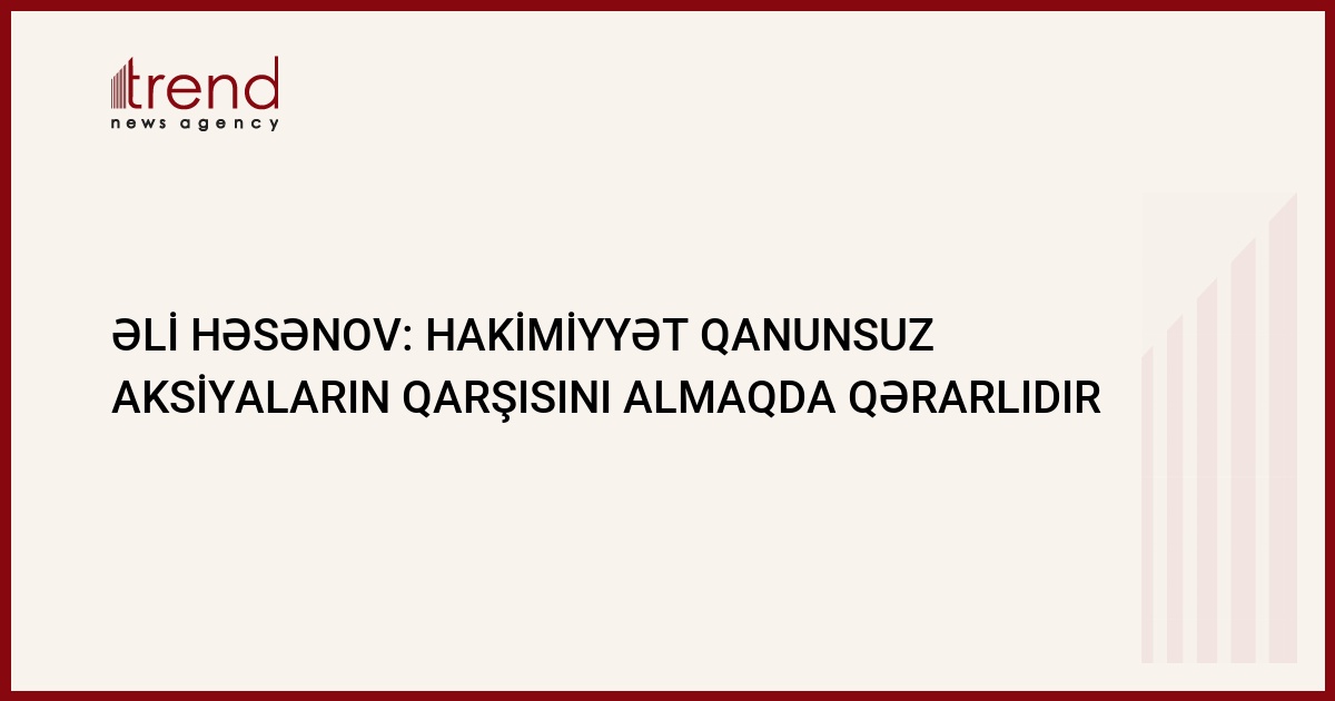"Hakimiyyət izacə verilməyən hər bir aksiyanın qarşısını almaqda qərarlıdır. Biz Azərbaycanı xaos, anarxiya dövrünə qaytarmaq fikrində deyilik. Hakimiyyətin mövqeyi budur ki, müxalifətin seçkiqabağı bütün təbliğat-təşviqat işlərinə şərait yaratmaqla bərabər, eyni zamanda onların "qaydasız oyun" şərtlərini də qəbul etməyəcəyik. Qanunsuz keçirilən tədbirlərin də qarşısını alacağıq". Trend in məlumatına görə, bu fikirləri KİV-lərə açıqlamasında Prezident Aparatı ictimai siyasi şöbənin müdiri Əli Həsənov bildirib.
