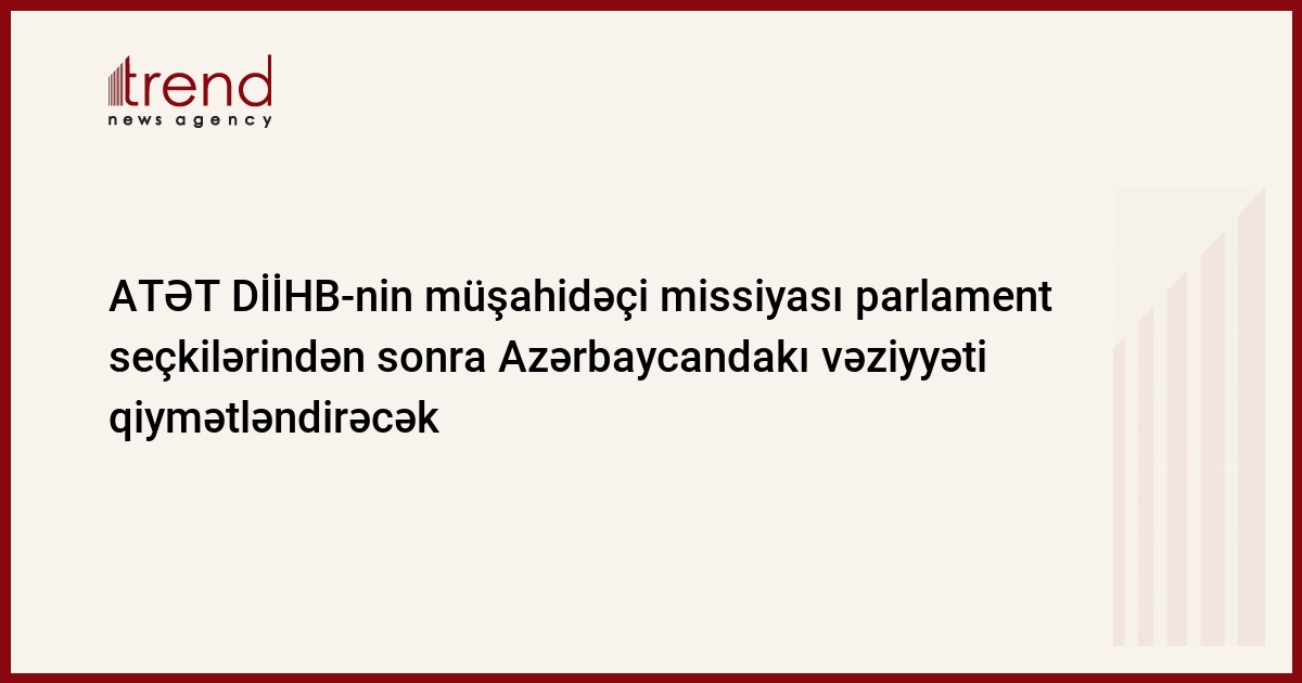 ATƏT-in demokratik institutlar və insan haqları Bürosunun (DİİHB) müşahidəçi missiyası Azərbaycandakı seçkiqabağı vəziyyəti diqqətlə izləməkdə davam edir və yalnız səsvermə günündən sonra son qiymətini verəcək. Bu barədə Trend ə missiya rəhbərinin assistenti Haydi Smit "Parlament seçkilərinə hazırlıq və seçkilərini keçirilməsi ilə bağlı təxirəsalınmaz tədbirlər haqqında" Azərbaycan prezidentinin 25 oktyabr tarixli sərəncamını şərh edərkən bildirib.