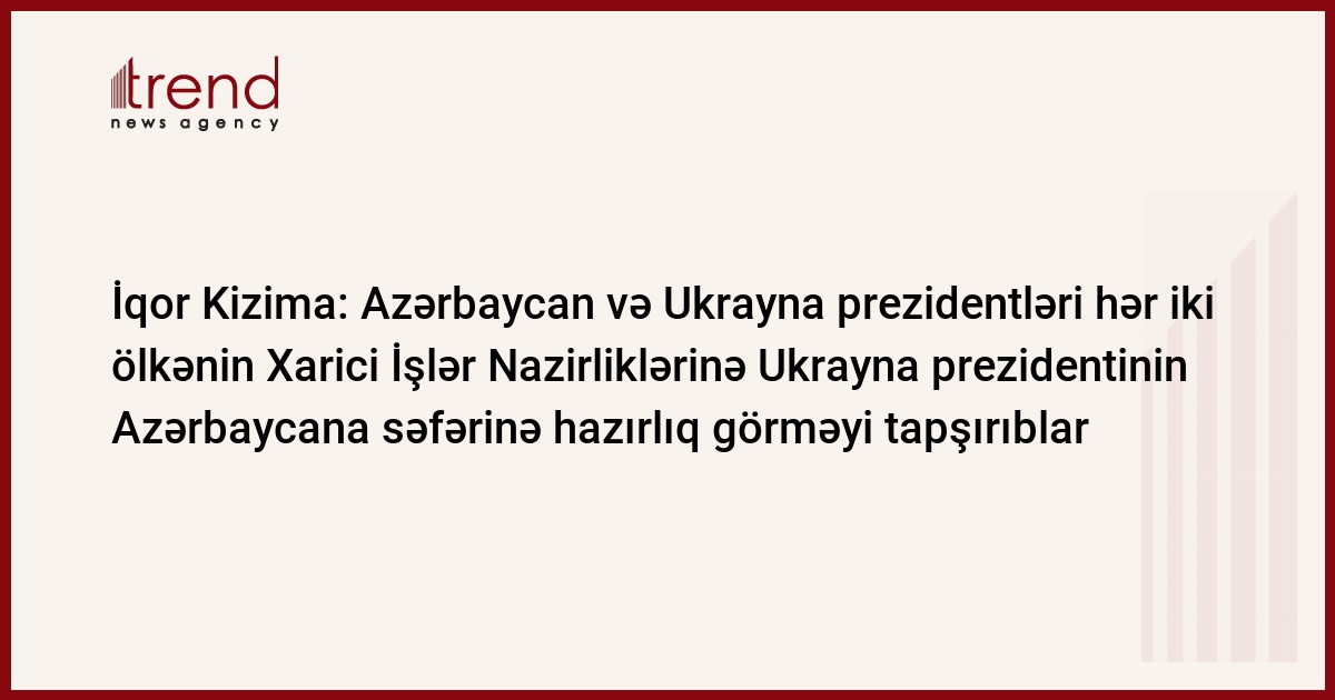 Azərbaycan və Ukrayna prezidentləri hər iki ölkənin Xarici İşlər Nazirliklərinə Ukrayna prezidenti Viktor Yuşenkonun Azərbaycana rəsmi səfərinə hazırlıq görməyi tapşırıblar. Bu barədə Trend ə eksklüziv olaraq Ukraynanın Azərbaycandakı işləri üzrə müvəqqəti müvəkkili İqor Kizima hər iki dövlət başçısının bu yaxınlarda baş tutmuş telefon bağlantısını şərh edərkən bildirib.