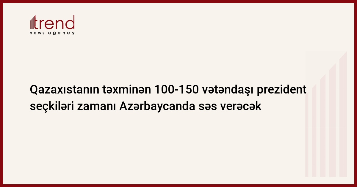 Qazaxıstanın təxminən 100-150 vətəndaşı həmin ölkədə dekabrın 4-də keçiriləcək prezident seçkiləri zamanı Azərbaycanda səs verəcək. Bu barədə Trend ə Qazaxıstanın Azərbaycandakı konsulu Dastan Süleymonov bildirib.
