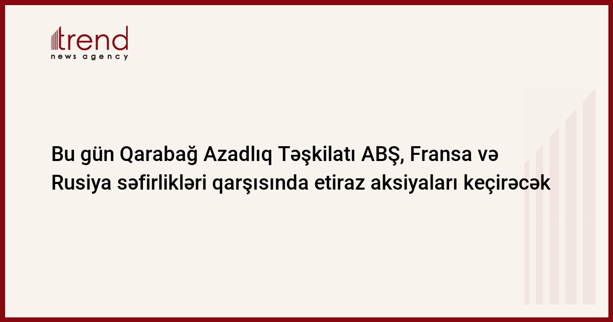 Noyabrın 30-da Qarabağ Azadlıq Təşkilatının (QAT) bir qrup fəal üzvü ABŞ, Fransa və Rusiyanın ölkəmizdəki səfirlikləri qarşısında etiraz aksiyası keçirəcək. Bu barədə Trend ə QAT-dan məlumat verilib. Bildirilib ki, hər üç səfirlik qarşısında aksiya ayrı-ayrı saatlarda növbə ilə keçiriləcək.