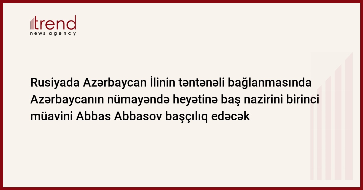 Rusiyada Azərbaycan İlinin təntənəli bağlanma mərasiminə Azərbaycanın hökumət nümayəndə heyətinə hökumətin baş nazirinin birinci müavini Abbas Abbasov başçılıq edəcək. Bu barədə Trend ə diplomatik mənbələrdən məlum olub.